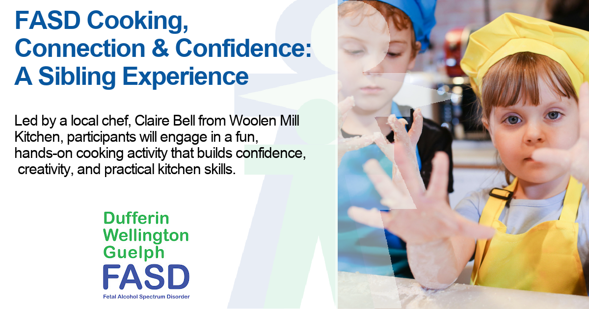 This interactive cooking experience is designed specifically for siblings who have a brother or a sister with possible or diagnosed Fetal Alcohol Spectrum Disorder (FASD) and who reside in Dufferin Wellington or Guelph. Led by a local chef, Claire Bell from Woolen Mill Kitchen, participants will engage in a fun, hands-on cooking activity that builds confidence, creativity, and practical kitchen skills.